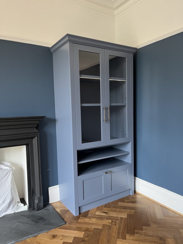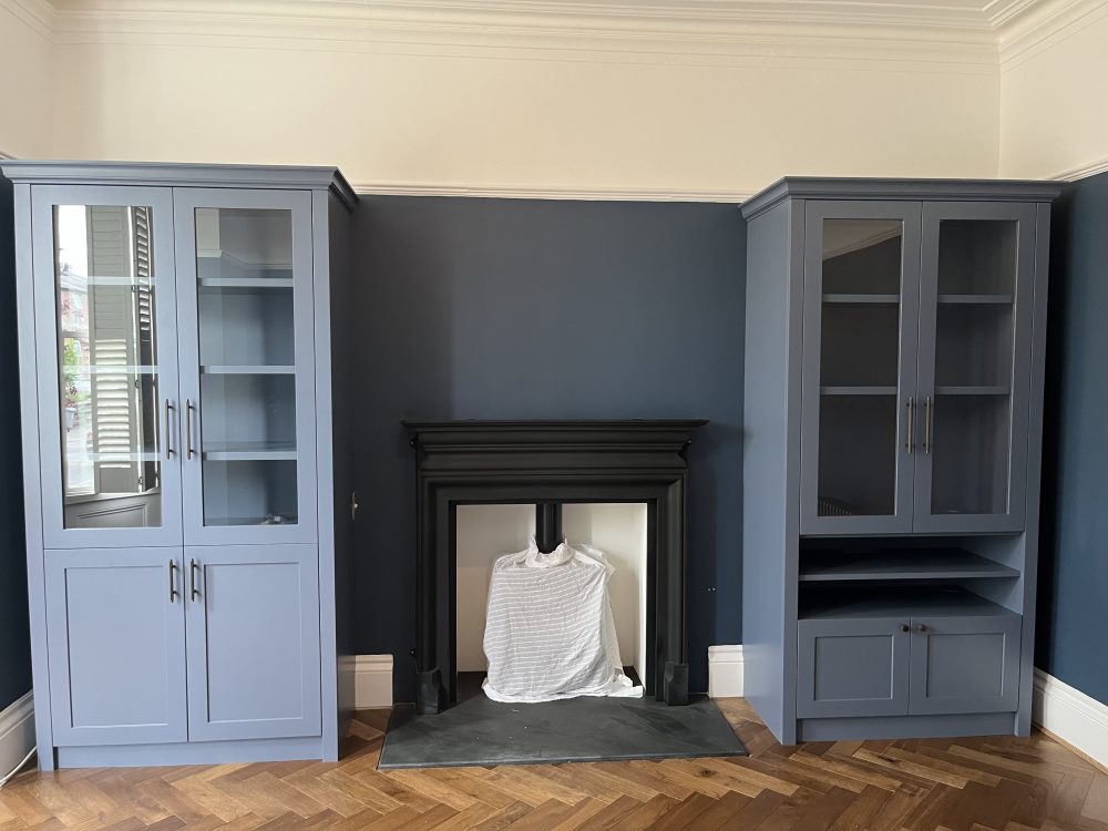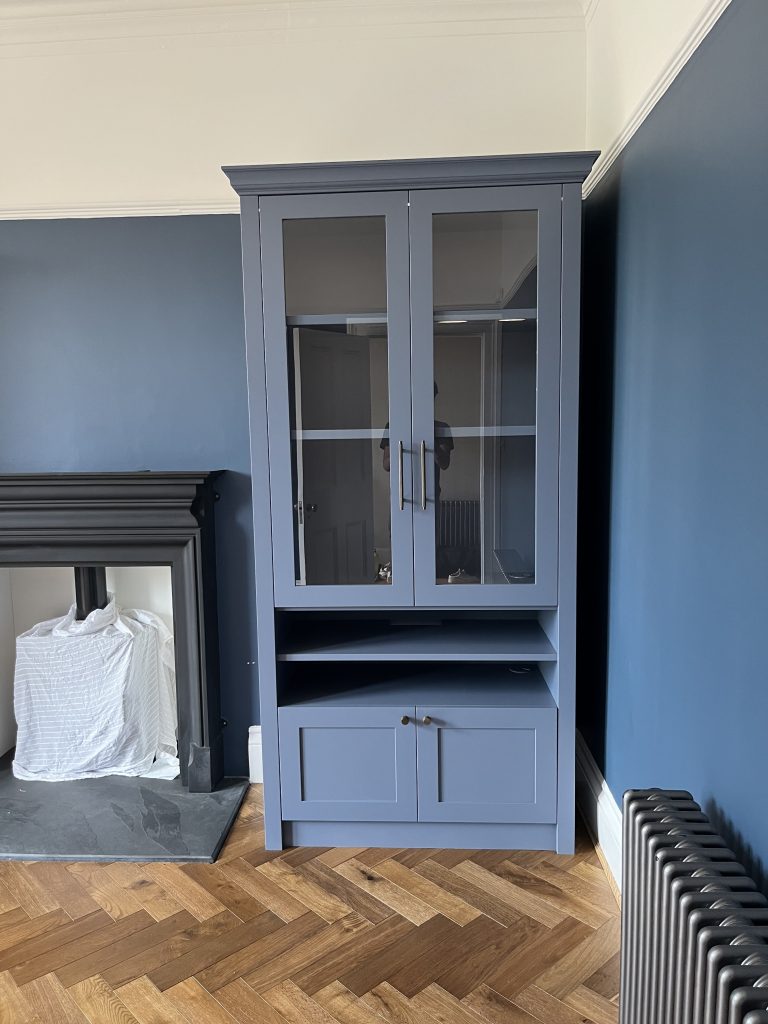 These display cabinets are a lovely addition to the living room. The bottom cabinets will eventually be filled with records and the right hand side has a spot for the amplifier and turntable.