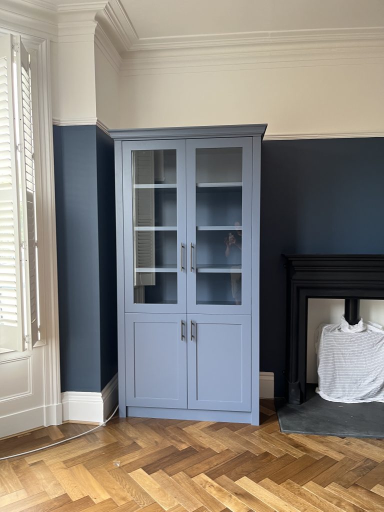 Sprayed in Little Greene Juniper Ash and paired with Knurled T bar handles and knobs from Plank. Take a closer look here.
