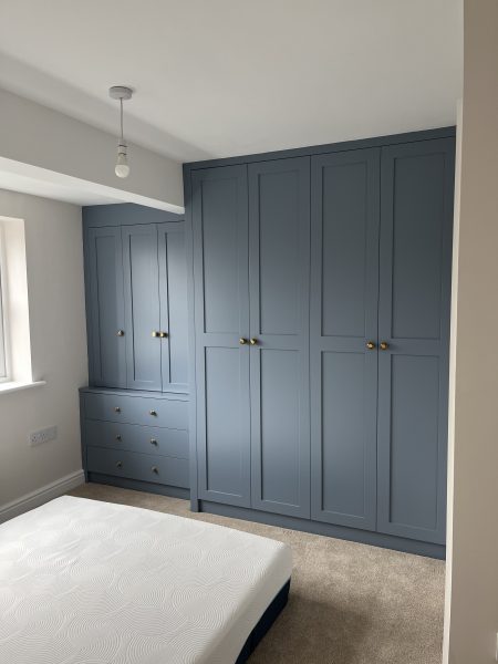 We made Olivia an extra tall wardrobe with shaker doors, sprayed in F&B Pointing and brass handles. Most importantly, we have plenty of storage inside with a set of 3 drawers, long and short hanging with lots of shelf space above taking advantage of those tall ceilings.
